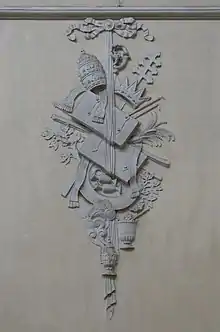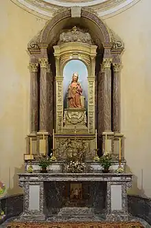 Plusieurs œuvres en stuc d'Augustin Ollivier ornent le chœur de la basilique. D'une part, quatre statues représentant les Pères de l'Église sont disposées entre les colonnes : Augustin d'Hippone, Ambroise de Milan, Grégoire le Grand et Jérôme de Stridon[25]. D'autre part, deux trophées du même sculpteur datant de 1773 se trouvent de chaque côté du chœur : ils symbolisent le sacerdoce et l'eucharistie[26].