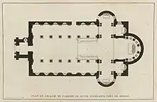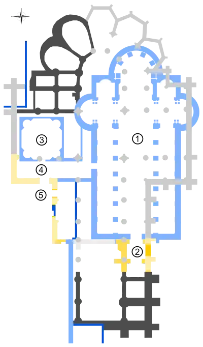 Plusieurs éléments de cette deuxième église sont toujours présents. Une campagne de fouilles, effectuée dans l’entre-deux-guerres[6] et approfondie dans les années 1950[7], a mis au jour les fondations du déambulatoire et des cinq chapelles rayonnantes du chœur au chevet de l’actuelle basilique[6]. À l'avant subsistent des vestiges du transept et une travée du collatéral nord avec un départ de voute, de même qu'une porte en arc brisé reliant autrefois le cloitre au transept. Enfin, l'ogive d'une fenêtre du collatéral sud est encore visible à la base de la tour actuelle[2].