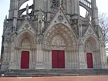 Au tympan du portail central est figurée la Vierge en majesté aux côtés de laquelle s'inclinent deux anges ; aux tympans des portails latéraux sont représentées deux scènes de la vie de la Vierge : à gauche, son enfance auprès de ses parents, sainte Anne et saint Joachim ; à gauche, les fiançailles avec saint Joseph.