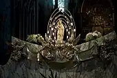 - Le maître-autel est dédié à l’Immaculée Conception. Il est surmonté d’un ciborium (baldaquin) riche en symboles mariaux. Au centre des douze branches issues de l’arbre de Jessé trône la statue de Notre-Dame. La basilique contient cinq autres autels dont quatre sont polychromes.