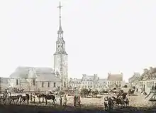 Au XVIIe siècle, le supérieur des sulpiciens de l'époque, François Dollier de Casson, dessine les plans de la première église paroissiale de la ville, située dans l'axe de la rue Notre-Dame, face à l'emplacement de l'église actuelle. La construction de ce lieu de culte de style baroque, nommé église de Ville-Marie, commence en 1672 pour s'achever en 1683. On l'agrandit une première fois avec l'ajout d'un clocher, entre 1723 et 1725, suivi de bas-côtés, en 1734 et 1739[2]. Au milieu du XVIIIe siècle, la construction de jubés permet d'accueillir un nombre grandissant de paroissiens, dont certains doivent assister aux offices sur le parvis, voire dans la rue[2].