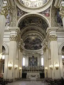 L'intérieur, dans le style de la fin de la Renaissance, frappe par la profusion des dorures, la richesse des marbres et les somptueuses fresques de l'académie bolonaise des Incamminati, inspirées des récits de l'Ancien Testament, qui ornent les voûtes et les coupoles. Dans les carrés et divisions des voûtes se déroule un cycle pictural qui a pour sujet les femmes de l'Ancien Testament.