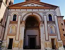 La grande arche centrale est encadrée par des pilastres corinthiens qui s'étendent sur toute la hauteur de la façade, constituant l'un des premiers éléments de l'architecture de la Renaissance pour lesquels cette solution a été adoptée, que l'on appellera ordre colossal. Sur les cloisons murales, deux niches sont superposées entre les pilastres au-dessus des deux portails latéraux. La façade peut s'inscrire dans un carré et toutes les mesures de la nef, aussi bien en plan qu'en élévation, se conforment à un module métrique précis.