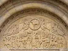 Le tympan de ce portail représente le sacrifice d'Abraham, un agneau divin, avec des détails qui, pour la plupart, ne sont pas cités dans la Bible : Isaac enfourchant un animal de selle, ou encore Isaac enlevant ses chaussures et se déshabillant une fois arrivé. Cet élargissement de l'action donne à comprendre que le fils d'Abraham s'est rendu à la volonté de Dieu et accepte de bonne grâce son destin.
