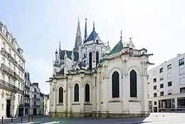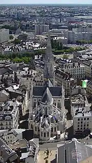 Sous l'impulsion de Félix Fournier, curé de la paroisse et futur évêque de Nantes, la construction de l'église actuelle s'échelonne de 1844 (pose de la première pierre) à 1869 (bénédiction de l'édifice)[9] sur un terrain exigu qui l'oblige à être orientée sur un axe nord-sud, et non pas est-ouest comme le voudrait la tradition chrétienne (soleil levant sur le sanctuaire). L'édification du clocher occupe à elle seule les quinze dernières années des travaux. Une médaille commémorative célèbre la pose de la première pierre de la nouvelle église, sous le règne de Louis-Philippe, l'administration du préfet Achille Chaper et du maire Ferdinand Favre[10]. L'église est bâtie en granite de la région, ainsi qu'en pierres dures et tuffeau de Touraine. Le projet est confié à Jean-Baptiste-Antoine Lassus[11], élève de Henri Labrouste et collaborateur de Eugène Viollet-le-Duc, qui en fait, avec Piel[12], l'un des tout premiers projets néo-gothiques en France[Note 1]. Elle est érigée en basilique mineure le par le pape Léon XIII[13].