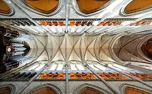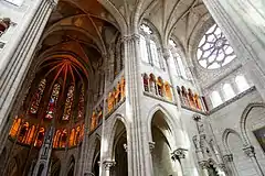 « l'église était gravement atteinte, dans son déambulatoire, le long de le rue Affre, près du clocher qui fut heureusement épargné. Deux ogives de voûte sont disloquées. (...) Il semble qu'un projectile de D.C.A. ou une bombe de petit format soit tombée perpendiculairement ou ait éclaté au sol (...) puis d'autres bombes, entrées obliquement, ouvrirent les cintres et les murs de clôture, disloquèrent en partie les boiseries de l'orgue, éventrèrent le sol... Le tombeau de Mgr Fournier, lourd socle de marbre, est brisé. »[15]. La guerre finie, le chantier de reconstruction débute en 1953 et dure jusqu'en 1974. Le grand-orgue endommagé, datant de 1901, est ainsi démonté, mais ultérieurement reconstruit, en deux tranches de travaux, en 1963 et 1985.
