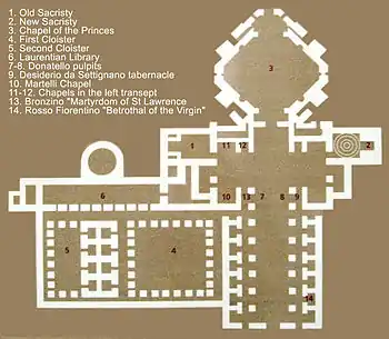 L'église se présente comme une croix latine à trois nefs, avec des chapelles latérales le long des nefs latérales et du transept. À l'intersection des bras se trouve un dôme. L'agencement, comme dans d'autres œuvres de Brunelleschi, s'inspire d'autres œuvres de la tradition florentine médiévale, telles que Santa Croce, la basilique Santa Maria Novella ou Santa Trinita, mais à partir de ces modèles, Brunelleschi s'est inspiré de quelque chose de plus rigoureux, avec des résultats révolutionnaires : l'innovation fondamentale réside dans l'organisation des espaces le long de l'axe médian en appliquant la notion de module à la fois en plan et en élévation, correspondant à la taille d'une travée carrée, avec la base de 11 braccie fiorentine, à peu près la même que le Spedale degli Innocenti construit à partir de 1419, qui fait 10 braccie fiorentine. L'utilisation du module régulier, avec la répétition rythmique conséquente des membres architecturaux, définit un balayage en perspective d'une grande clarté. Les deux bas-côtés sont déterminés comme le développement symétrique de la loggia de l'hôpital, appliqué pour la première fois à l'intérieur d'une église :en effet, ici aussi l'utilisation de la travée carrée et de la croisée d'ogives génère la sensation d'un espace marqué, comme une série régulière de cubes imaginaires surmontés d'hémisphères.