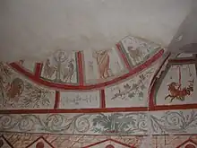 Une cour-nymphée montre une peinture murale représentant Proserpine entourée de putti à bord d'une embarcation, avec des traces d'une autre scène marine et de mosaïques sous les arcs des fenêtres. Plus tard, entre les IIIe et IVe siècles est créé une sorte d'oratoire qui présente des scènes à thèmes chrétiens ou décoratifs, parmi lesquels des génies ailés, des couronnes, des oiseaux. Puis une confession vient se greffer sur l'ensemble vers la fin de ces années-là, en bordure du Clivus Scauri, avec des sujets chrétiens et des scènes de martyres : décollations des saints Crispe, Crispinien et Benedicte, en plus de figures féminines et de celle d'un orant.
