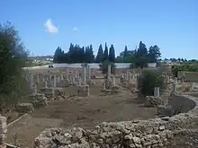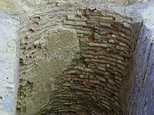 À l'ouest se situent des chapelles à des fins liturgiques et une salle hypostyle avec sur ses côtés des cellules et des chapelles où les archéologues ont retrouvé des mosaïques funéraires et des sarcophages. Dans l'espace appelé armoires étaient conservés selon Delattre les huiles, les vases et les linges nécessaires lors des baptêmes[49]. Delattre a aussi signalé sur le côté occidental un caveau voûté avec arcosolium d'une hauteur et d'une longueur supérieure à trois mètres[51]. La cella possédait un décor simple de mosaïque blanche et cinq arcosolia ayant abrité des sépultures[52]. Les fouilles ont livré des sépultures dont l'une contenait du fil d'or et un début d'étude anthropométrique a été mené sur deux squelettes[26].