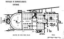 Immense édifice au départ (mesurant 65 mètres sur 45[3] avec neuf nefs et onze travées pour l'espace central), le site se compose, outre la basilique, d'un baptistère et d'un ensemble pouvant avoir abrité des moines (ou des religieuses selon Delattre[42]). Dans son dernier état, le monument est très réduit, avec trois nefs et cinq travées uniquement, ce qui dénote une forte dégradation[43].