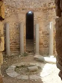 La crypte contenait seize colonnes de marbre rose, hautes de 3,45 mètres et distantes l'une de l'autre de 1,60 mètre[53], ainsi que des niches. Une seule colonne était intacte, les autres ayant été redressées par l'équipe de fouille[55]. Des chapiteaux de l'époque de Théodose ont été retrouvés dans le monument et déposés au musée Lavigerie. Ils étaient décorés d'aigles ou de béliers et alternaient avec des niches[19]. Le sol portait une mosaïque en mauvais état[56] et un stylobate de deux mètres de diamètre ayant peut-être comporté des colonnes.