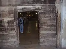 Les Croisés fortifient l'église et réduisent la porte justinienne au XIIe siècle probablement pour se protéger des envahisseurs ou conserver l'impression de grotte (l'arc brisé gothique au-dessus de la porte actuelle est un vestige de cette porte de l'époque croisée). Elle est à nouveau abaissée après 1515 et réduite à sa forme (entrée rectangulaire avec jambages et architrave) et dimension actuelle afin d'assurer la sécurité du lieu. Selon la tradition, elle a été construite très basse pour éviter l'entrée de combattants ottomans à cheval et pour forcer le fidèle à se baisser, d'où son nom de « Porte de l'Humilité ». Certains Juifs orthodoxes refusent d'emprunter cette porte[51]. Cette entrée sert également de sortie, ce qui n'est pas sans danger en cas d'urgence, comme un incendie par exemple.