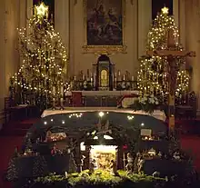 Ces deux autres autels sont exclusivement utilisés par les Latins qui s'y rendent en procession la nuit de Noël pour y porter un petit Jésus dans un berceau d'or. Selon la tradition, les premiers chrétiens y vénéraient comme relique une mangeoire d'argile qui fut remplacée, sous l'empereur Constantin, par une crèche d'argent aujourd'hui disparue. Les Franciscains ont construit un passage souterrain pour pouvoir accéder directement à la grotte depuis leur cloître[62].
