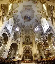 Le chœur est séparé de la nef par une grille. Le maître-autel est créé par Karl Sebastian Flacker. Au centre, il y a une sculpture de la Vierge à l’Enfant, qui est adorée par deux anges. La figure, qui mesure 28 cm, est faite en bois de tilleul et elle vient de la fin du XIVe siècle.