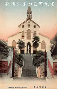 En 1863, deux prêtres français des Missions étrangères de Paris, les pères Louis Furet et Bernard Petitjean, débarquent à Nagasaki avec l'intention de construire une église en l'honneur des 26 martyrs du Japon, ces neuf prêtres européens et dix-sept chrétiens japonais crucifiés en 1597 sur ordre de Toyotomi Hideyoshi. L'église est terminée en 1864 et inaugurée par le consul Léon Dury, le 15 février 1865[3]. Construite par Koyama Hidenoshin, le maître charpentier de Glover Garden, c'était à l'origine une petite église en bois avec trois nefs et trois tours octogonales[4]. L'actuel bâtiment est une basilique de style gothique bien plus grande qui date d'environ 1879. Cette version a été construite en brique de stuc blanc avec cinq nefs, des plafonds voûtés et une tour octogonale. La conception est très probablement inspirée d'un plan belge utilisé par les missionnaires catholiques dans une ancienne église construite à Osaka[4]. Les vitraux ont été importés de France.
