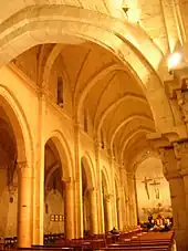 La basilique possède trois nefs précédées par un narthex, divisées par sept baies, un transept et une abside au bout de la nef. Elle est divisée en sept travées d'arcs en ogive, situé sur l'entablement de l'intérieur de la nef centrale. La nef est donc constituée de sept quadrilatères, parfois recouvertes d'un manchon.