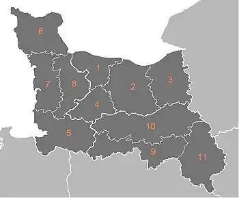 En revanche, celui des Lexoviens (Lieuvin, Lisieux), traditionnellement réputé haut-normand, a subi une division administrative après la Seconde Guerre mondiale et se trouve désormais à cheval sur les deux régions avec son chef-lieu Lisieux. Son évêché a été supprimé à la Révolution et c'est désormais la circonscription de l'évêque de Bayeux. [réf. nécessaire].