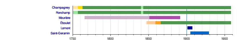 Deux concessions sont accordées en 1757 après la découverte de la houille vers 1744 : la concession des seigneurs de Ronchamp à Ronchamp, accordée le , et la concession des princes-abbés de Lure à Champagney, accordée le . Elles fusionnent le 1er mars 1763[3],[28],[29].