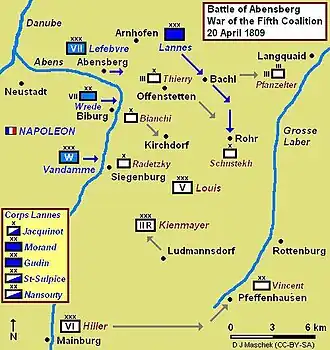 La nouvelle stratégie formulée par Napoléon prévoyait de regrouper autour d'Abensberg, c'est-à-dire au centre du dispositif français, une force d'attaque qui serait placée sous les ordres du maréchal Jean Lannes. Ce dernier, revenu du front espagnol profondément découragé, avait retrouvé son enthousiasme et sa vigueur d'antan à l'issue d'un long entretien seul à seul avec l'Empereur[43]. Le maréchal se voyait confier la direction d'un corps d'armée provisoire formé des divisions Morand et Gudin, soustraites pour l'occasion au IIIe corps de Davout, et des divisions de cavalerie lourde Nansouty et Saint-Sulpice ; cette force serait soutenue sur sa droite par les troupes bavaroises du VIIe corps de Lefebvre, le VIIIe corps du général Vandamme et les divisions Tharreau et Boudet du IIe corps. Lannes avait pour ordre d'attaquer entre Hausen et Siegenburg de manière à rompre le centre de la ligne autrichienne et, en passant par Rohr et Rottenburg, de se diriger sur Landshut pour y faire sa jonction avec le IVe corps de Masséna en marche depuis Freising. De cette façon, c'est du moins ce que pensait Napoléon, toute l'aile gauche autrichienne serait encerclée et anéantie. Pendant ce temps, le maréchal Davout, avec les deux dernières divisions du IIIe corps, celles de Friant et de Saint-Hilaire, devait rester sur la défensive entre Teugen et Abbach en attendant l'évolution de la situation sur les autres secteurs. L'Empereur, arrivé à Abensberg le matin du 20 avril pour superviser directement les opérations, avait prévu dans un second temps d'encercler les troupes autrichiennes restées isolées au sud du Danube, croyant que la garnison française de Ratisbonne avait déjà procédé à la destruction du pont[44].