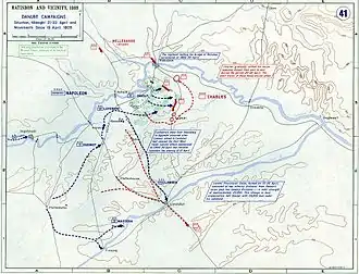 L'optimisme de Napoléon découlait de son analyse de la situation et des décisions prises par l'archiduc Charles. Le 17 avril, ce dernier, rendu confiant par les premiers succès, avait commencé à avancer sur le Danube. Dès le lendemain, cinq corps d'armée — les IIIe, IVe, Ve ainsi que les Ier et IIe corps de réserve[30] — se dirigèrent en deux colonnes en direction de Kelheim afin de traverser le fleuve et attaquer le IIIe corps du maréchal Davout avec le soutien des deux corps d'armée laissés sur la rive nord, ces derniers étant couverts sur leur flanc gauche par le VIe corps de Hiller. Ayant été informé que Davout se trouvait déjà probablement sur la rive sud du Danube, l'archiduc modifia partiellement ses plans et décida d'attaquer les Français par le nord, faisant à cet effet traverser le fleuve au IIe corps du général Kollowrat[31].