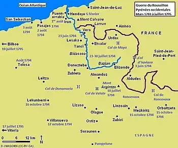 Le 15 octobre 1794, Moncey lance une offensive sur un large front avec 46 000 hommes. Les divisions françaises étaient commandées par Delaborde, Frégeville et les généraux de division Jean Mauco, Thomas Alexandre Dumas et Jean-Antoine Marbot. Les généraux de brigade Antoine Digonet, Pierre Rouché (Roucher), Louis Hyacinthe Le Feron, Pierre Bories de Castelpers et Jean Daniel Pinet commandent les brigades pendant l'opération[N 1],[1]. Le duc d'Osuna dirige les no 13000 espagnols de Navarre. Ses commandants sont les généraux Manuel Cagigal, Antonio Filangieri[N 2], Frias et le marquis de la Canada Ibagniez[1].