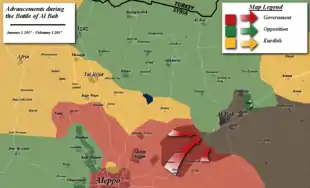 De leur côté, les forces du régime syrien, commandées par le général Souheil al-Hassan, commencent également à progresser en direction d'al-Bab[57]. Le 2 février, après 20 jours de combats, l'armée syrienne affirme avoir avancé sur 16 kilomètres depuis l'autoroute d'Alep et repris 32 villages et hameaux soit une superficie de 250 km2[58]. Elle n'est alors plus qu'à 3 kilomètres d'al-Bab[59]. Les Turcs et les rebelles lancent alors une nouvelle offensive au sud-est de la ville, afin de couper la route aux troupes du régime syrien[59].