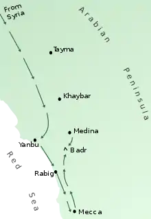 Vers 622, Mahomet et plusieurs de ses compagnons (muhâjirûn) quittent la ville de La Mecque à la suite des violences qu'ils commencent à y subir de la part de la tribu des Quraysh, et s'installent à Yathrib (actuellement Médine), au cours de l'épisode de l'Hégire[2]. Malgré les accords conclus dans la constitution de Médine, les muhâjirûn restent en marge de la vie socioéconomique locale et commencent à s'attaquer aux caravanes faisant du commerce à La Mecque[2].