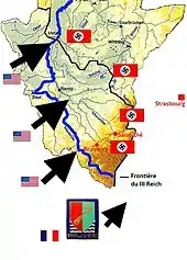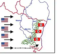 Toutefois, le commandement américain changea sa stratégie initiale et transmit de nouveaux ordres à la 7e armée US le 29 septembre 1944 : l'attaque orientée vers l'Est sur l'ensemble du front fut abandonnée au profit d'une offensive orientée vers le Nord-Est et la ville de Strasbourg[23]. Cette nouvelle stratégie répondait à de nouvelles donnes, mais aussi à un déplacement des lignes ou limites attribuées à chaque unité pour ses opérations. En effet, ce fut à la 1re Armée française que l'on confia la tâche de prendre la Trouée de Belfort. Du coup, les Américains s'étant fixé pour objectif principal la ville de Strasbourg comprirent qu'ils n'avaient pas d'autre choix que d'opérer quelques brèches dans le Massif vosgien, non seulement dans sa partie méridionale, dans les vallées de la Vologne, de la Meurthe et de la haute Moselle, mais aussi dans sa partie septentrionale et centrale avec les pays de Badonviller et Sarrebourg.