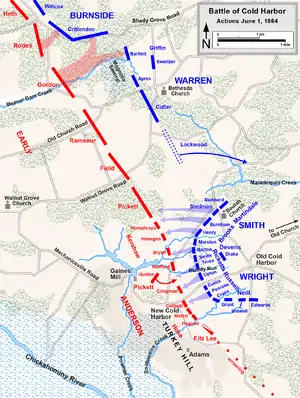 Le , pour prendre possession du village de Cold Harbor, Grant envoya la cavalerie de Sheridan en avant. Arrivant à destination, les cavaliers nordistes durent livrer combat face aux cavaliers sudistes dirigés par Fitzhugh Lee, neveu du général Lee, renforcés par de l'infanterie. Après un bref engagement, les Confédérés se replièrent et prirent position au sud-ouest du village.