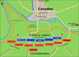 Corydon était le siège du comté de Harrison et l'ancienne capitale de l'Indiana. La ville et la compagne environnante comptaient environ un millier d'habitants[30]. La population avait travaillé toute la nuit pour édifier des parapets à l'aide de rondins placés sur une crête juste au sud de la ville. Deux espions confédérés avaient déjà infiltré Corydon et fait leur rapport à Morgan. Une fois les parapets achevés, la Légion se retira vers la ville, s'établissant derrière eux. De nombreux habitants plus âgés rejoignirent les défenseurs, qui étaient désormais 450[31]. Malgré les appels d'urgence pour obtenir des renforts adressés aux commandants à New Albany, leurs troupes ne purent arriver avant le début de la bataille[9],[32],[33].