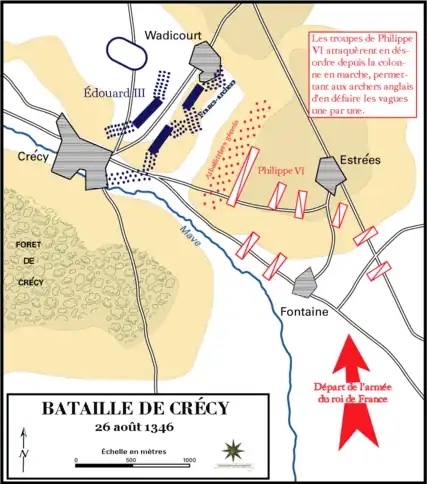 L'armée française, beaucoup plus nombreuse, de 24 000 à 50 000 hommes, est organisée sur trois lignes. Au-devant on trouve les arbalétriers génois, ainsi que deux lignes de chevaliers. Le reste est composé de troupes à pied qui occupent l'arrière et les côtés. L'armée française n'a aucune tactique pour la bataille et arrive en fin de journée de manière confuse devant la position anglaise.