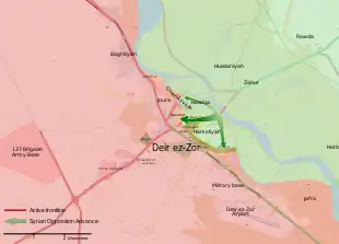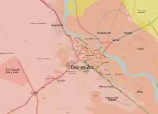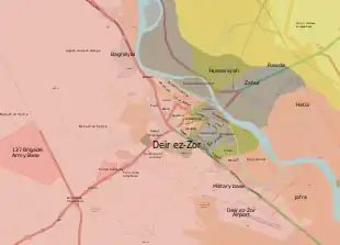 Le 17 septembre, les loyalistes reprennent le village d'al-Jafra, à l'est de l'aéroport, et atteignent les rives de l'Euphrate ; les djihadistes se retrouvent alors à leur tour presque encerclés et acculés contre le fleuve[179]. Le 18 septembre, malgré les avertissements des FDS, les troupes du régime syrien franchissent l'Euphrate au sud-est de Deir ez-Zor[180]. Le même jour, les loyalistes s'emparent de l'île d'Hawija Sakr, à l'est de Deir ez-Zor, qui est alors contrôlée à 75 % par le régime selon l'OSDH[181],[182],[183].