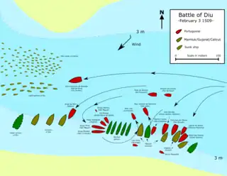 Cette flotte arriva le , dans le but de soutenir la rébellion de la population de Diu, qui avait mobilisé et armé dans le plus grand secret, 10 000 fantassins et 5 000 cavaliers.