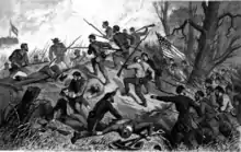 Sur son aile droite, une colonne d'attaque de trois brigades, couverte sur chaque flanc par une autre brigade, charge les assaillants sudistes.
