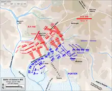 La division d'A. P. Hill a traversé le Beaver Dam Creek tôt le matin, trouvant l'ancienne ligne de l'Union légèrement défendue. Alors qu'ils se dirigent vers l'est et s'approchent de Gaines's Mill à peu près au moment que les hommes de D. H. Hill sont engagés, Porter demande officiellement à McClellan d'envoyer la division de Slocum à travers la Chickahominy par le pont Alexander pour le soutenir. La brigade de tête d'A. P. Hill, sous les ordres du brigadier général Maxcy Gregg, est retenue par les tirailleurs du 1st U.S. Sharpshooters du colonel Hiram Berdan et le 9th Massachusetts Infantry. En début d'après-midi, il rencontre la forte opposition de Porter, déployée le long du Boatswain's Creek et le terrain marécageux est un obstacle majeur pour l'avance. Les attaques menées par les brigades des brigadiers généraux Gregg, Dorsey Pender, Joseph R. Anderson, et Lawrence O''Bryan Branch font peu de progrès. Un engagement particulièrement sanglant a eu lieu alors que le 1st South Carolina Rifles attaque une batterie du Massachusetts, mais est repoussé par les zouaves du 5th New York, qui infligent 57 % de pertes (76 tués, 221 blessés, et 58 disparus) aux Caroliniens du Sud, les plus grandes pertes régimentaires confédérées de la journée[10].