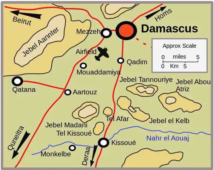 Kissoué était une position défensive solide. À l'est de la route, les jardins et les maisons de la ville fournissaient une couverture à l'infanterie et aux chars, soutenus par les travaux de défense considérables sur les collines abruptes de Jebel el Kelb et de Jebel Abou Atriz, derrière eux. À l'ouest de la route se trouvaient les collines de Tel Kissoué, Tel Afar et Jebel Madani qui commandaient les routes vers Damas depuis Quneitra et Daraa. Le pays parsemé de rochers était pratiquement impraticable aux véhicules à roues, sauf sur la route, et rendait la progression difficile même à pied[2]. De plus, la rivière Awaj coulait devant les positions françaises à travers la ligne d'avancée alliée.