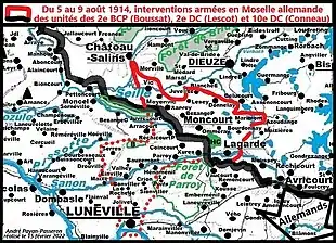 Le général Dubail va laisser les forces ennemies progresser dans son secteur[9] tandis que le général Castelnau va couvrir les incursions armées en Moselle allemande du général Lescot qui, sous les ordres de Foch, dispose notamment des 1 500 chasseurs du 2e BCP et des 4 200 « sabres » de sa 2e DC : le jusqu'à Moncourt, Lagarde et château Marimont.