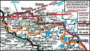 Durant cette journée du , le général Castelnau commandant la 2e armée reçoit les ordres suivants du GQG concernant la poursuite de l’offensive et le front à atteindre en soirée du . À 9 h 30, il reçoit d’abord l’ordre no 25[20] qui précise un front Delme-Dalhain-Bensdorf (noté 25 sur la carte). Mais, à 14 h, le général Castelnau reçoit l’ordre no 26[21] qui remplace le précédent : le front à atteindre est maintenant celui de Delme-Baronville-Virming-rivière Albe (noté 26 sur la carte). Un front 25 qui, en date du 19 août, est le seul mentionné et détaillé dans le JMO de la 2e armée comme dans les JMO de ses trois autres grandes unités : 68e DR (2e groupe de DR), 15e corps et 16e corps[22]. En revanche[23], la partie du front 26 « Marthille-Baronville-gare de Morhange » est celle que le général Foch a fixée[24] à ses troupes.