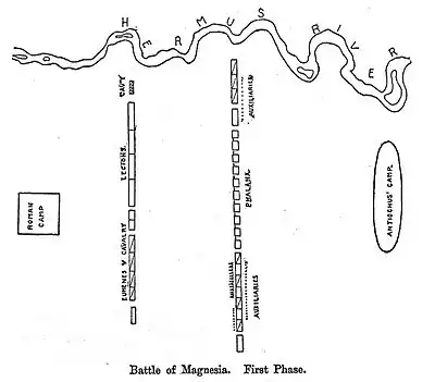 Sur l’aile gauche séleucide, les chars et les dromadaires mènent la charge contre l’aile droite d’Eumène. Tite-Live amoindrit au maximum le rôle du roi de Pergame dans la bataille. Ce sont pourtant ses fantassins légers et tirailleurs qui vont entourer et mitrailler de leurs projectiles les chevaux des attelages, et non pas leurs conducteurs. Dans leur fuite, les chars à faux vont traverser la ligne des cataphractraires de l'aile gauche séleucide qui fuient à leur tour sans combattre et Eumène va alors entamer une sanglante poursuite de ces troupes. Pour le reste de la bataille, Appien constitue une meilleure source que Tite-Live.