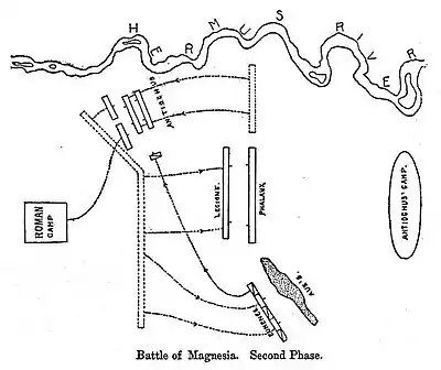 Alors qu’Antiochos a écrasé toute la cavalerie romaine sur l'aile gauche ainsi qu'une légion entière avec ses cataphractaires, il décide, comme à la Raphia, de poursuivre les fuyards jusqu’au camp romain plutôt que d'encercler l'armée romaine, faute tactique qui cause sa défaite. Les phalangites séleucides au centre sont largement victorieux et repoussent impitoyablement les hastati romains qui se replient en hâte, ayant subi de fortes pertes. La cavalerie romaine se positionne sur l'aile gauche séleucide pour encercler les phalangites, bien trop solides à combattre de face. Eumène harcèle la phalange avec l'aide de Domitius. Celle-ci s’est, d’après Appien, formée correctement en carré défensif en accueillant en son sein les tirailleurs séleucides, alors que Tite-Live n’en parle même pas. Les légionnaires alliés et romains restant sont incapables de lutter contre la phalange, et la tactique employée consiste à inonder la phalange de projectiles en tous genres.