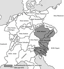 En 1253, Ottokar II devient roi de Bohême à la suite de la mort de son père. Sa montée en puissance dans le sud-est de l'Empire est vue d'un mauvais œil par le roi Béla IV de Hongrie, qui entre en campagne contre lui mais est finalement vaincu en 1260 à la bataille de Kressenbrunn. En 1269, Ottokar s'empare du duché de Carinthie, incluant la marche de Carniole et la marche windique, et il chasse également Philippe de Carinthie, le frère du dernier duc, de son patriarcat en Frioul. Arrivé au faîte de son pouvoir, il vise désormais la couronne impériale ; néanmoins, les princes-électeurs se méfient de lui et préfèrent élire comme roi des Romains le comte Rodolphe de Habsbourg, le .