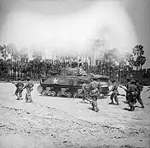 Trois jours plus tard, le 28 février, la 17e division attaqua Meiktila de tous côtés, appuyée par une artillerie massive et des frappes aériennes. La 63e brigade indienne procéda à pied pour établir un barrage routier au sud-ouest de la ville afin d'empêcher les renforts japonais d'atteindre la garnison, tandis que le corps principal de la brigade attaquait depuis l'ouest. La 48e brigade indienne attaqua du nord sur la route principale de Thabutkon, bien qu'elle fût retardée par une position forte autour d'un monastère à la périphérie de la ville[29]. La 255e brigade blindée, avec deux bataillons d'infanterie et une batterie de canons automoteurs Sexton de 25 livres sous commandement, débloqua un barrage routier au nord-est et fit un large balayage autour de la ville pour capturer les aérodromes à l'est et l'attaquer depuis le sud-est. L'essentiel de l'artillerie de la division (dans un port au nord-ouest de la ville, protégé par des unités de la 99e brigade) et des frappes aériennes fut affecté à l'appui de l'attaque de la 255e brigade.
