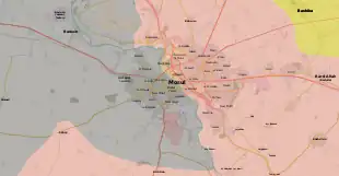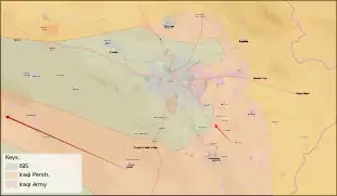 De son côté, la 9e division blindée progresse dans le désert au nord-ouest de Mossoul[316]. Le 1er mars, elle s'empare du dernier axe routier menant à Tall Afar, isolant ainsi les force de l'EI à Mossoul-Ouest[317],[318],[319]. Non loin de là, le 7 mars, la 9e division blindée et les miliciens chiites de la Division de combat d'al-Abbas reprennent la prison de Badoush — théâtre d'un massacre en 2014 — au nord-ouest de Mossoul[320],[321]. Puis, le 12 mars, la 9e division blindée coupe la route Tall Afar aux abords de Mossoul et achève l'encerclement complet de la ville[322],[323]. La ville de Badoush est quant à elle reconquise le 15 mars[324],[321].