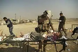 Selon Amnesty International et Human Rights Watch, des civils fuyant les combats sont également torturés et exécutés sommairement par des membres des forces gouvernementales irakiennes[456],[457]. Des photos et des vidéos réalisées entre octobre et décembre 2016 par le journaliste Ali Arkady sont publiées en mai 2017, montrant des séances de tortures commises sur des civils par des membres des Forces d'intervention rapide[458],[459],[460]. Le journaliste irakien accuse également les membres de cette unité d'avoir commis des viols et des exécutions sommaires[458],[460]. En novembre 2016, Amnesty International accuse également une milice de la tribu Al-Sabaoui — membre des Hachd al-Chaabi, mais sunnite — d'actes de tortures contre des civils[461],[462].