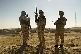 Du côté de la coalition, 7 000 à 7 500 hommes sont déployés au sol dans le nord de l'Irak, dont 4 600 à 5 000 Américains[57],[34],[100], issus notamment de la 101e division aéroportée[101]. La coalition établit son quartier-général dans la base de Qayyarah, vingt kilomètres à l'ouest de la ville[102],[103], sous le commandement du lieutenant-général Stephen J. Townsend[104]. Un millier de soldats de la coalition occupent cette base, en plus de 5 000 hommes de la 15e division irakienne[103]. Les États-Unis disposent de lance-roquettes M142 HIMARS et d'hélicoptères Apache[105],[106]. L'armée française a quant à elle déployé en septembre cinq CAESAR et 150 à 180 soldats dans la base de Qayyarah[107],[101],[88],[108],[109],[103]. Environ 500 conseillers militaires, pour la plupart Américains, épaulent également les forces irakiennes[106]. Des forces spéciales, notamment américaines[110], françaises[111], canadiennes[112], allemandes[113] et australiennes (en)[114] participent également à la bataille. Mais l'essentiel des appuis feu de la coalition est fourni par ses forces aériennes qui engagent en permanence plusieurs dizaines d'avions au-dessus de Mossoul[106],[115].