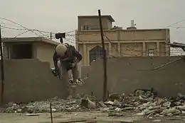 Cependant, le 17 mars, une frappe aérienne de la coalition visant deux snipers de l'EI souffle un groupe de bâtiments dans le quartier d'Al-Djadida et tue entre 105 et 200 civils[346],[347],[348],[349],[350],[351],[352],[19],[353]. Selon l'armée américaine et l'armée irakienne, ce bilan humain particulièrement lourd est dû à la présence d'un important dépôt de munitions de l'EI dans un bâtiment touché par le raid, ce qui a provoqué une deuxième explosion[353],[19]. La zone du bombardement passe ensuite sous le contrôle des forces irakiennes et le 23 mars de nombreux corps sont retirés des décombres par la défense civile[351],[354],[355]. Le 25 mars, l'armée irakienne et la coalition annoncent avoir décidé de faire une pause dans leur offensive en raison du nombre élevé des pertes civiles[356],[351],[357]. L'offensive reprend le 27 mars[358]. Le 30 mars, le colonel américain Joe Scrocca, un porte-parole de la coalition, annonce qu'il reste « moins d'un millier de djihadistes » à Mossoul[359].