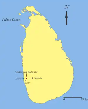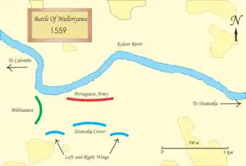 La bataille de Mulleriyawa (singhalais : මුල්ලේරියාව සටන) en 1559 faisait partie de la guerre cinghalaise-portugaise. Ce fut l'une des batailles les plus décisives de l'histoire du Sri Lanka et considérée comme la pire défaite des Portugais au cours de cette période sur cette île. Selon les chroniques locales, les marais de Mulleriyawa sont devenus rouges de sang après la déroute des portugais[7]. Avec cette victoire, le Royaume de Sitawaka a émergé comme une puissance militaire capable de défier l'expansion portugaise.