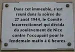 Le comité militaire des F.T.P. - M.O.I. s'est réuni le matin du 27 août et a décidé de proposer l'insurrection pour le lendemain. Les hommes veulent en découdre[24]. Le même jour, deux réunions sont organisées au huitième étage du Palais Stella situé au 20 boulevard de Cessole[Note 6]. Celle du matin est d'ordre militaire et celle de l'après-midi d'ordre politique. Sont présents Souny, chef départemental F.T.P., Armand, pour les « Milices patriotiques » des entreprises, Jean-sans-peur, pour les F.T.P.F. de Nice, Ludovic, pour la M.O.I. (Main d'œuvre immigrée), Thibaud, pour la C.G.T., Pierre Durand, Georges, responsable départemental du Parti communiste et aux F.T.P., plus un invité, Bemard, cadre régional bloqué à Nice. Brandon, du Front National (mouvement de résistance créé par le Parti Communiste Français à ne pas confondre avec le Front national, organisation de coordination des partis nationalistes français de droite, active entre 1934 et 1938, ni avec le parti politique d'extrême droite créé en 1972), et Duchêne, du Parti communiste, sont absents pour des raisons de sécurité. Ensemble, ils forment le Comité insurrectionnel. Cependant, René Houat, président du comité insurrectionnel, a écrit dans le PCA N°1617 du 18 au 24 septembre 1998, qu'il conteste la composition des personnes présentes. La décision est prise de déclencher le soulèvement général pour le lendemain dès six heures en dépit de la pénurie d'hommes entraînés (100 à 200 hommes) d'armes et de munitions (des grenades, 20 mitrailleuses, 40 mousquetons et quatre mitrailleuses lourdes)[24]. Une plaque commémorative est aujourd'hui visible à droite de la porte d'entrée de l'immeuble et rappelle cette importante réunion.