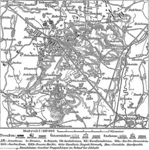 Initialement, l'armée autrichienne n'a que la 1re armée prussienne et l'armée de l'Elbe face à elle, les unités du prince héritier étant encore en chemin. En effet, à la suite d'une coupure des lignes télégraphiques, l'ordre d'attaque décidé le soir précédent par Frédéric-Charles n'est transmis à l'armée emmenée par le prince héritier que vers 4 h du matin (deux cavaliers ont dû chevaucher toute la nuit). En conséquence, la pression se fait au fil des heures de plus en plus forte sur les troupes prussiennes en sous-effectif.