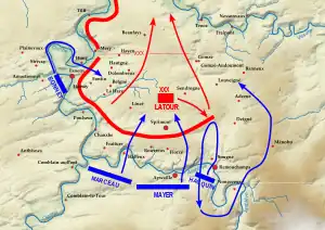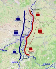 Cependant, Jourdan avait, sous commandement de Schérer, concentré quelques 40.000 hommes, dont la plupart sur son aile droite, face à Latour, avec l'intention de lancer quatre divisions en passant la rivière Ourthe et son affluent, l'Amblève. L'attaque principale devait venir des divisions des généraux Marceau, Jean Mayer et Honore Hacquin sur l'Amblève, qui enrobait le flanc des troupes de Latour, alors que la division de Jean Pierre Francois Bonnet (également épelé Bonet) devait lancer une attaque frontale secondaire sur les troupes de Latour à Esneux, ce qui permettait aux quatre divisions françaises d'encercler Latour depuis deux fronts[3]:242.